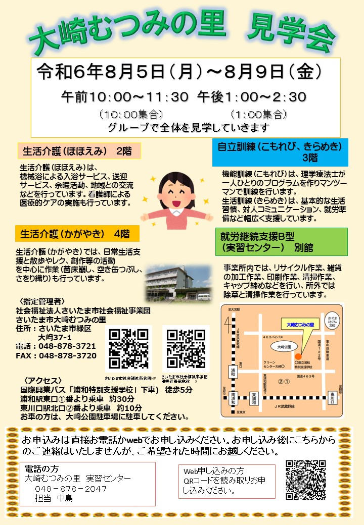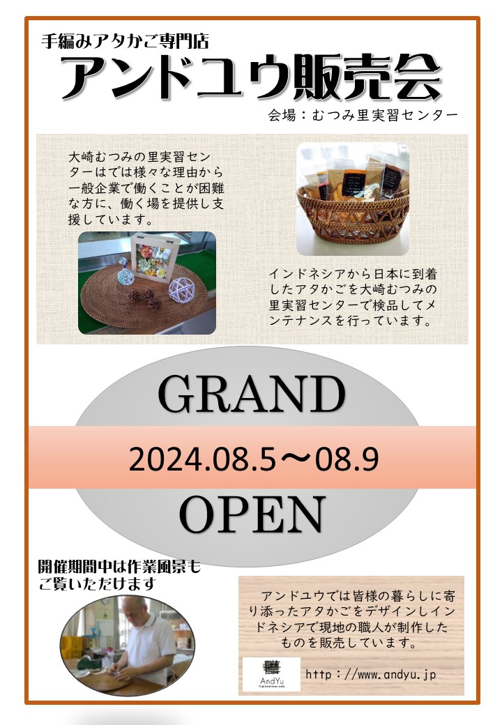 見学会&アンドユウ販売会のお知らせ|お知らせ お知らせ 動画紹介 作品展 自主製品 採用情報 お知らせ NEWS お知らせ見学会&アンドユウ販売会のお知らせ 2024.07.19 施設からのお知らせ新着情報イベント 見学会&アンドユウ販売会のお知らせ 大崎むつみの里 第1事業所では8月5日(月)から9日(金)まで見学会を実施します。実習センターでは同時に『アジアン雑貨 AndYu』の販売会を実施いたします。お申し込み方法、お問い合わせ先についてはチラシをご覧ください。皆様のお越しをお待ちしております。 テーマ: お知らせ新着情報 関連施設: 大崎むつみの里第1事業所(かがやき) 大崎むつみの里第1事業所(こもれび) 大崎むつみの里第1事業所(きらめき) 大崎むつみの里第1事業所(はばたき) 大崎むつみの里第1事業所(大崎実習センター) 一覧へ戻る CATEGORY 事業団からのお知らせ 施設からのお知らせ 新着情報 イベント 採用情報 その他 ARCHIVE 2026 2025 2024 2023 2022 テーマ お知らせ 新着情報 採用情報