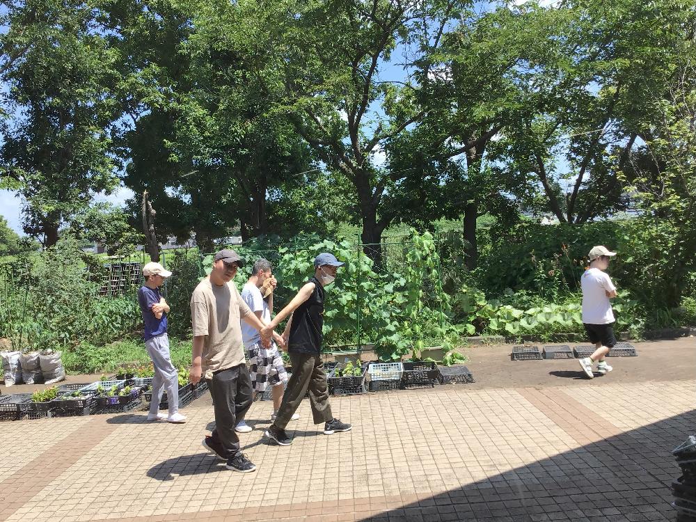〇うみグループの皆様は、快晴の空の下、テラスを散歩しています。