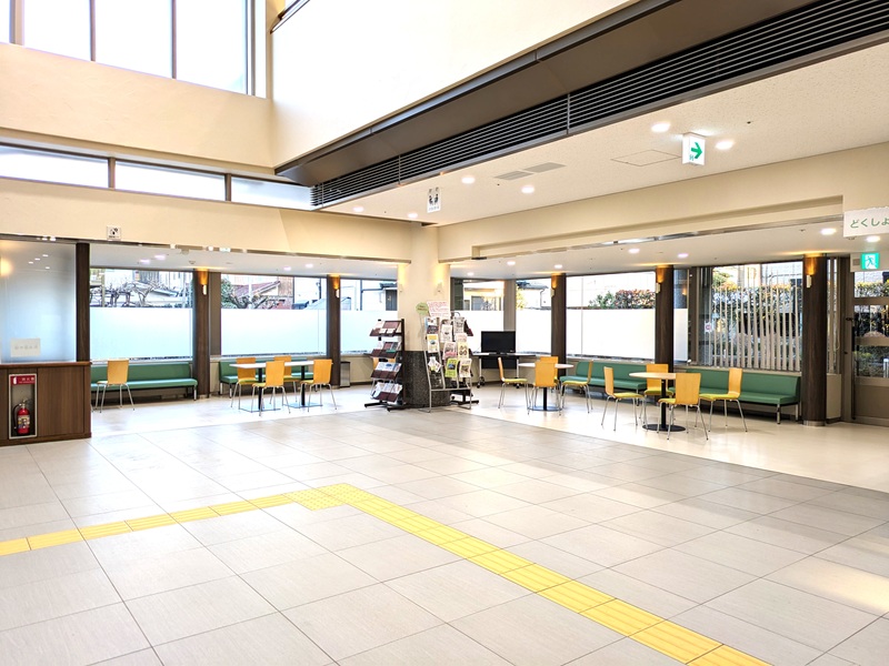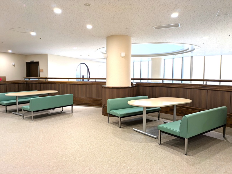 1階ロビーには、感染対策により撤去されていたイスとテーブルが再設置されました。休憩、ティータイムに是非ご利用ください。