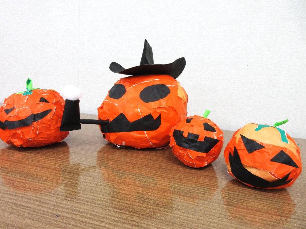 作品名:ハロウィン 作者名:OB会 作品紹介: 最初はおばけカボチャだけでしたが、「帽子をかぶった方がいい。」「そうしたらパイプを咥えたらもっとカッコ良くなる。」などどんどんアイデアを出しながら制作しました。