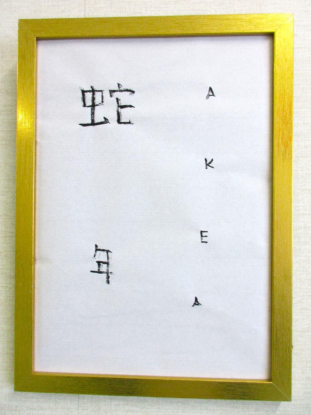 作品名:書き初め 作者名:H・T 作品紹介: 木曜クラブで好きなアイドルの名前を毛筆で書いて練習しているH・Tさん。「新年っぽいものを書いて。」とお願いするとさらさらっと書いてくれました。