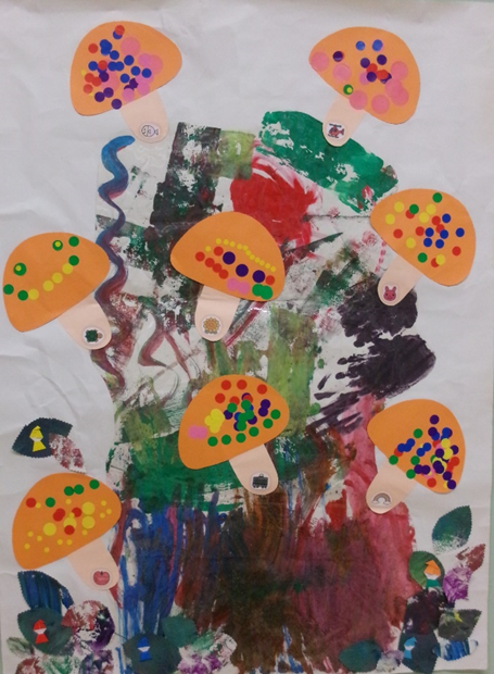 【作品について】原木部分は、園庭で絵の具あそびをした時の作品です。手のひらや筆などで色とりどりの絵の具を使い、さらに砂を撒くなど、自由に楽しみながら表現しました。思いがけずサンドアート?さながらに仕上がりました!カラフルな原木からは、みかんきのこ達がニョキニョキっと生えてにぎやかになりました。お子さんたちのダイナミックかつ色とりどりな作品をどうぞご覧ください。