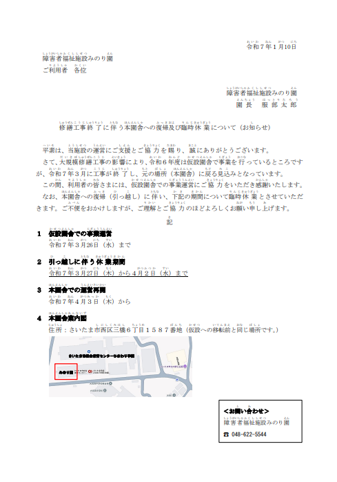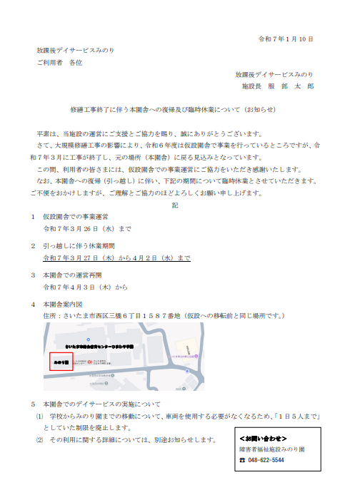 修繕工事終了に伴う本園舎への復帰及び臨時休業について|お知らせ お知らせ 動画紹介 作品展 自主製品 採用情報 お知らせ NEWS お知らせ修繕工事終了に伴う本園舎への復帰及び臨時休業について 2025.01.10 施設からのお知らせ新着情報 修繕工事終了に伴う本園舎への復帰及び臨時休業について この度、本園舎への復帰のため、臨時休業日が決定しましたのでお知らせいたします。 ご不明点等ございましたら、みのり園または放課後デイサービスみのりまでご連絡ください。 テーマ: お知らせ新着情報 関連施設: 障害者福祉施設みのり園 放課後デイサービスみのり 一覧へ戻る CATEGORY 事業団からのお知らせ 施設からのお知らせ 新着情報 イベント 採用情報 その他 ARCHIVE 2026 2025 2024 2023 2022 テーマ お知らせ 新着情報 採用情報
