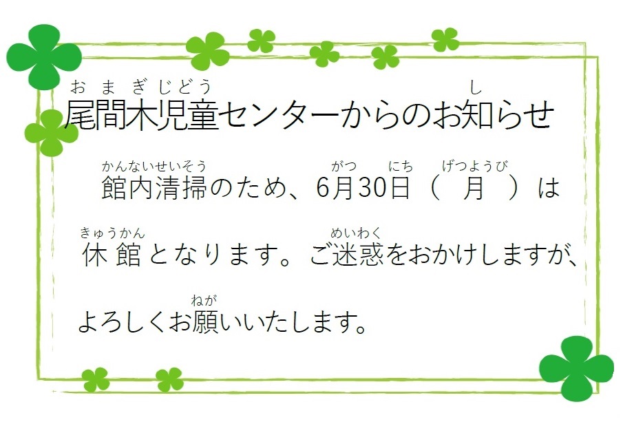 尾間木児童センター休館のお知らせ|お知らせ お知らせ 動画紹介 作品展 自主製品 採用情報 お知らせ NEWS お知らせ尾間木児童センター休館のお知らせ 2025.06.04 施設からのお知らせ 尾間木児童センター休館のお知らせ テーマ: 新着情報 関連施設: 尾間木児童センター 一覧へ戻る CATEGORY 事業団からのお知らせ 施設からのお知らせ 新着情報 イベント 採用情報 その他 ARCHIVE 2026 2025 2024 2023 2022 テーマ お知らせ 新着情報 採用情報