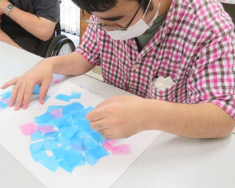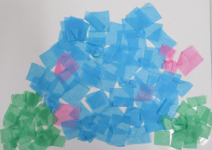 青色と水色の画用紙に紙粘土を貼り付けて、お花紙を1つ1つ差し込んでみました。