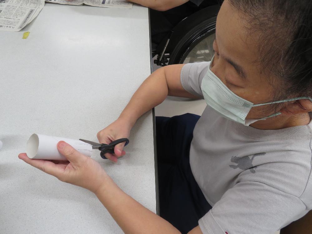 トイレットペーパーにハサミで切れ込みを沢山細かく入れていきます。