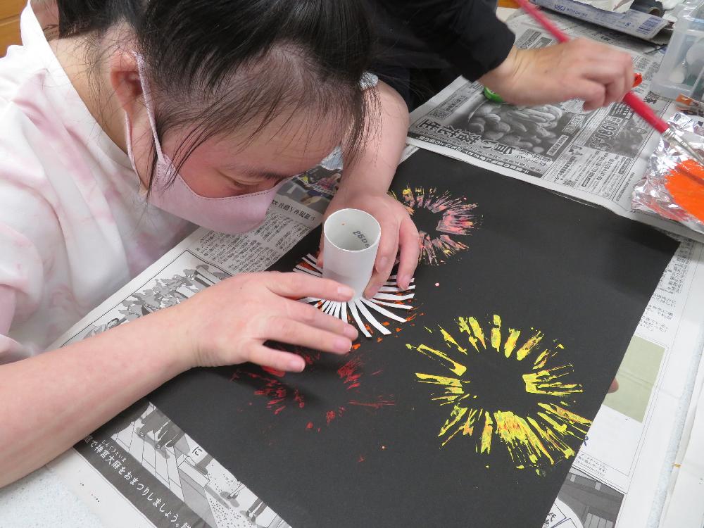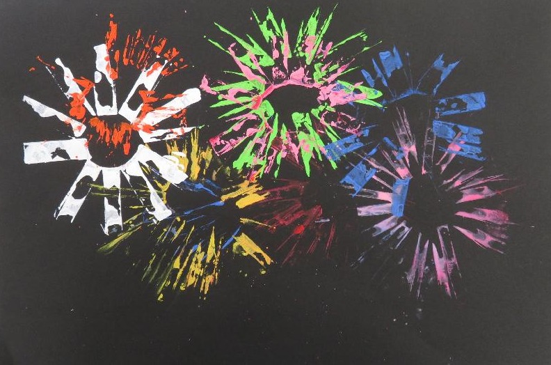 黒い画用紙に素敵な花火が色とりどりに打ちあがりました!