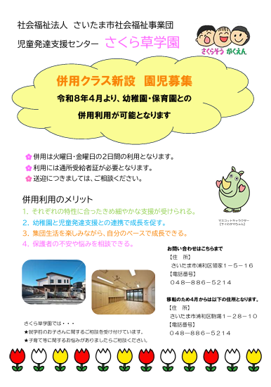 さくら草学園 令和8年度併用クラス新設 園児募集中 お知らせ 動画紹介 作品展 自主製品 採用情報 お知らせ NEWS お知らせ(さくら草学園)令和8年度併用クラス新設 園児募集中 2026.01.26 施設からのお知らせ新着情報 (さくら草学園)令和8年度併用クラス新設 園児募集中 さくら草学園では令和8年4月より、併用クラスを新設します。幼稚園・保育園との併用利用が可能となり、新規利用児を募集中です。 児童発達支援センターってどんなところ?さくら草学園ってどんなところ? お気軽にお問い合わせください。 テーマ: お知らせ新着情報 関連施設: さくら草学園 一覧へ戻る CATEGORY 事業団からのお知らせ 施設からのお知らせ 新着情報 イベント 採用情報 その他 ARCHIVE 2026 2025 2024 2023 2022 テーマ お知らせ 新着情報 採用情報