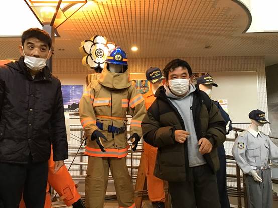 〇防災展示ホールで消防服とパチリ。本物の消防士?とビックリしました。