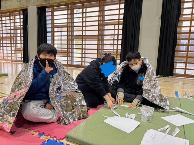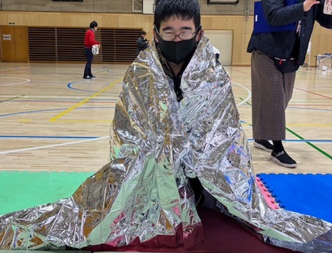 避難先で体を温める道具として、サバイバルシートを羽織りました。
