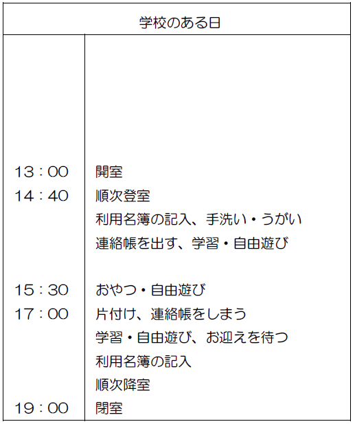 保護者が就労や疾病等の理由で、昼間児童の面倒を見ることができない場合につき、小学校1年生から6年生までの児童に対し、授業の終了後及び春、夏、冬休み及び土曜日等の学校休業日に、適切な遊び及び生活の場を提供することにより、児童の健全な育成を図ることを目的に設置された施設です。