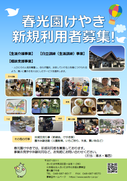 春光園けやき新規利用者募集!(←クリックしてください)|お知らせ お知らせ 動画紹介 作品展 自主製品 採用情報 お知らせ NEWS お知らせ春光園けやき新規利用者募集!(←クリックしてください) 2022.09.12 施設からのお知らせ 春光園けやき新規利用者募集!(←クリックしてください) テーマ: お知らせ 関連施設: 障害者福祉施設春光園けやき 一覧へ戻る CATEGORY 事業団からのお知らせ 施設からのお知らせ 新着情報 イベント 採用情報 その他 ARCHIVE 2026 2025 2024 2023 2022 テーマ お知らせ 新着情報 採用情報