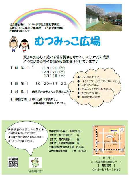 (大崎むつみの里第2事業所)むつみっこ広場のお知らせ|お知らせ お知らせ 動画紹介 作品展 自主製品 採用情報 お知らせ NEWS お知らせ(大崎むつみの里第2事業所)むつみっこ広場のお知らせ 2025.10.14 施設からのお知らせ新着情報イベント (大崎むつみの里第2事業所)むつみっこ広場のお知らせ むつみっこ広場を実施します。いろいろな遊びを用意してお待ちしています。お気軽にお越しください。一緒に楽しく遊びましょう♪ テーマ: お知らせ 関連施設: 大崎むつみの里第2事業所 一覧へ戻る CATEGORY 事業団からのお知らせ 施設からのお知らせ 新着情報 イベント 採用情報 その他 ARCHIVE 2025 2024 2023 2022 テーマ お知らせ 新着情報 採用情報