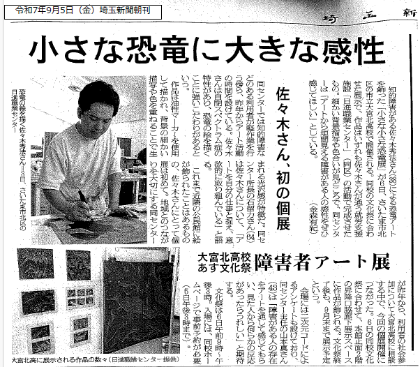 埼玉新聞に掲載されました|お知らせ お知らせ 動画紹介 作品展 自主製品 採用情報 お知らせ NEWS お知らせ埼玉新聞に掲載されました 2025.09.08 事業団からのお知らせ施設からのお知らせ新着情報 埼玉新聞に掲載されました 日進職業センターと大宮北高校の共同開催である「小さな小さな恐竜展」について、令和7年9月5日付埼玉新聞朝刊に掲載されました。 ↑記事をクリックすると大きな画面で見られます。 テーマ: お知らせ新着情報 関連施設: 日進職業センター 一覧へ戻る CATEGORY 事業団からのお知らせ 施設からのお知らせ 新着情報 イベント 採用情報 その他 ARCHIVE 2026 2025 2024 2023 2022 テーマ お知らせ 新着情報 採用情報
