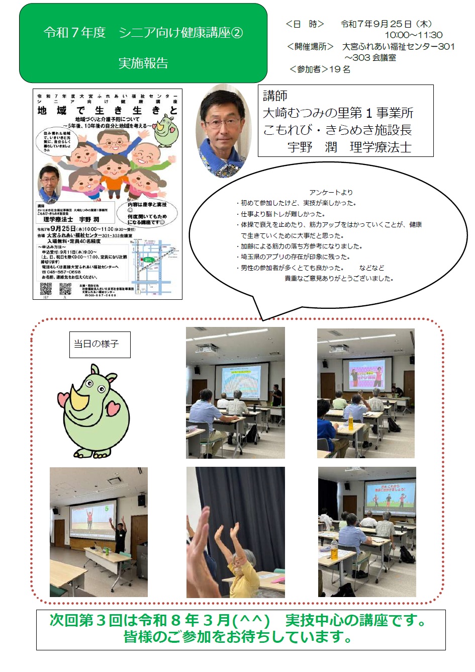 (大宮ふれセン)『シニア向け健康講座②』を開催いたしました。|お知らせ お知らせ 動画紹介 作品展 自主製品 採用情報 お知らせ NEWS お知らせ(大宮ふれセン)『シニア向け健康講座②』を開催いたしました。 2025.10.15 施設からのお知らせイベント (大宮ふれセン)『シニア向け健康講座②』を開催いたしました。 令和7年9月25日(木)『シニア向け健康講座② 地域で生き生きと』を開催いたしました。 当日の様子やご参加の皆様の声をまとめました。 次回第3回は令和8年3月、実技中心の講座を予定しております。皆様のご参加をお待ちしています。チラシPDF拡大 テーマ: お知らせ 関連施設: 大宮ふれあい福祉センター 一覧へ戻る CATEGORY 事業団からのお知らせ 施設からのお知らせ 新着情報 イベント 採用情報 その他 ARCHIVE 2026 2025 2024 2023 2022 テーマ お知らせ 新着情報 採用情報