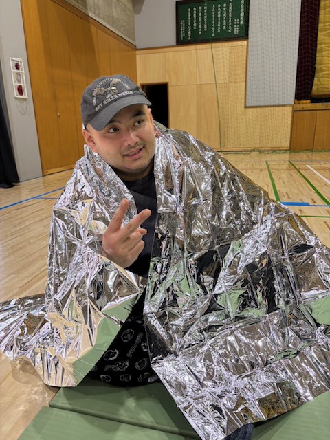 避難先で体を温める道具として、サバイバルシートを羽織りました。