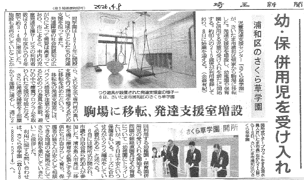 さくら草学園の開所式が新聞に掲載されました。|お知らせ お知らせ 動画紹介 作品展 自主製品 採用情報 お知らせ NEWS お知らせさくら草学園の開所式が新聞に掲載されました。 2026.04.15 事業団からのお知らせ施設からのお知らせ新着情報 さくら草学園の開所式が新聞に掲載されました。 4月6日に開催された、さくら草学園の開所式が8日の埼玉新聞に掲載されました。 テーマ: 新着情報 関連施設: さくら草学園 一覧へ戻る CATEGORY 事業団からのお知らせ 施設からのお知らせ 新着情報 イベント 採用情報 その他 ARCHIVE 2026 2025 2024 2023 2022 テーマ お知らせ 新着情報 採用情報